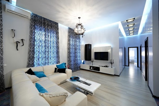 Пол выровнен стяжкой и уложен кварцвинил. Выполнен монтаж многоуровневых потолков из ГКЛ и ПВХ.